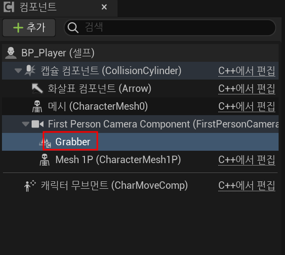 이제 바로 우리 일인칭 캐릭터인 BP_Player에 있는 카메라에 방금 추가한 Grabber를 어태치할 수 있다.