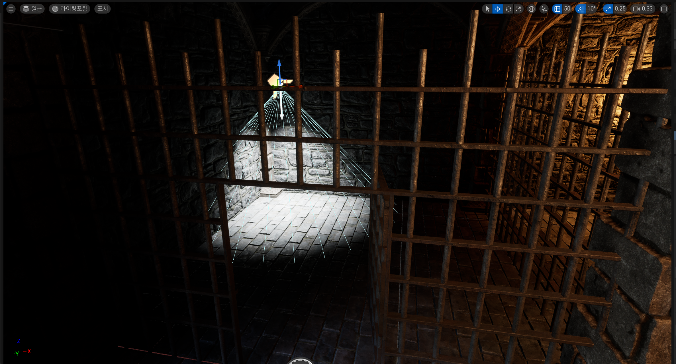 입구에서 바로 왼쪽 감옥의 문을 열고, 스포트라이트로 조각상이 있을 곳을 비춰서 강조하도록 해주었다.