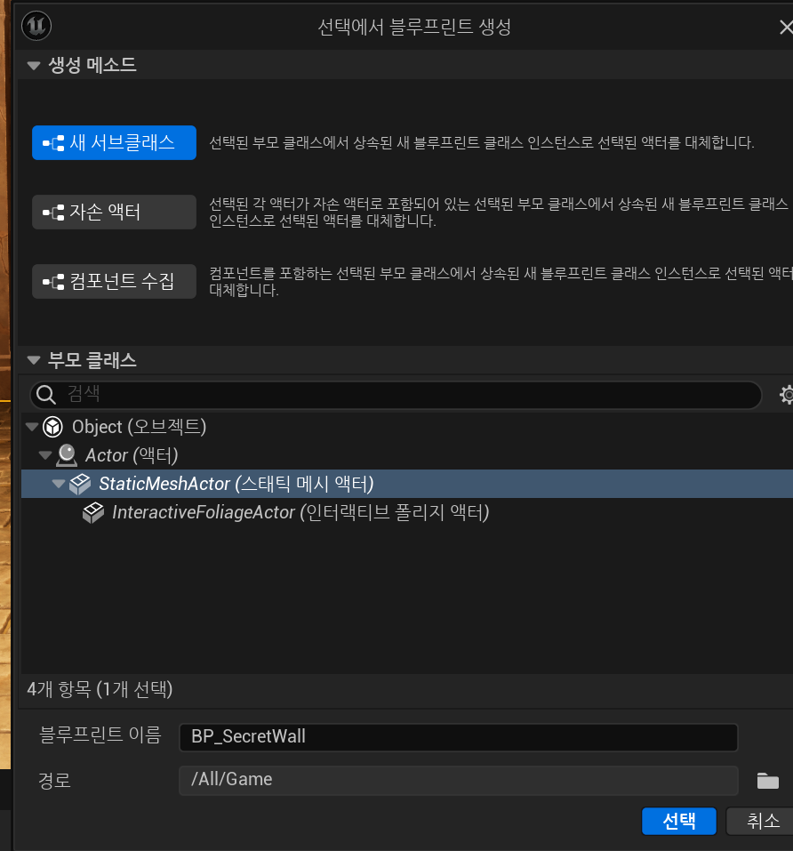 이를 위해 우선 비밀문의 블루프린트를 만들어주자.