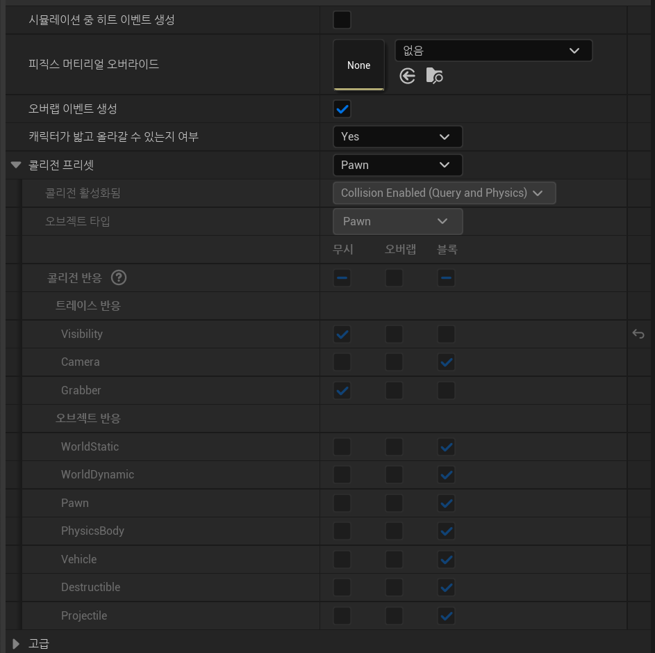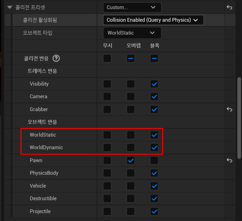 해당 박스의 콜리전 세팅을 보면 다음과 같이 기본적으로 거의 다 오버랩 되어있는 것을 볼 수 있다.