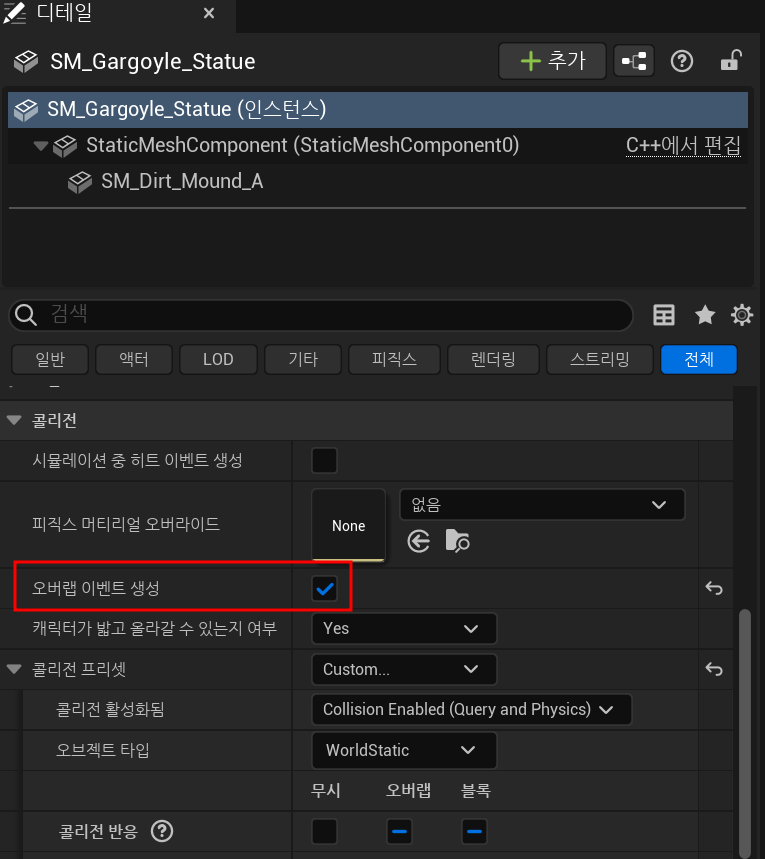 여기서 추가로 해주어야 하는 것이 가고일 조각상의 오버랩 이벤트를 활성화해주어야 한다.