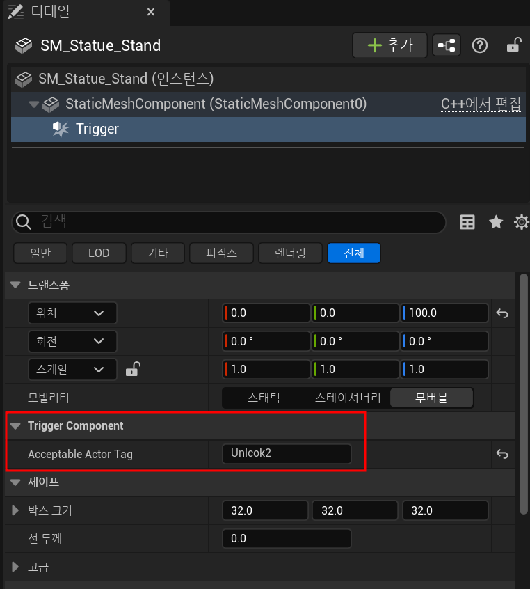 그리고 단상에는 트리거 컴포넌트를 추가해주고, 태그 이름을 Unlock2로 설정해준다.