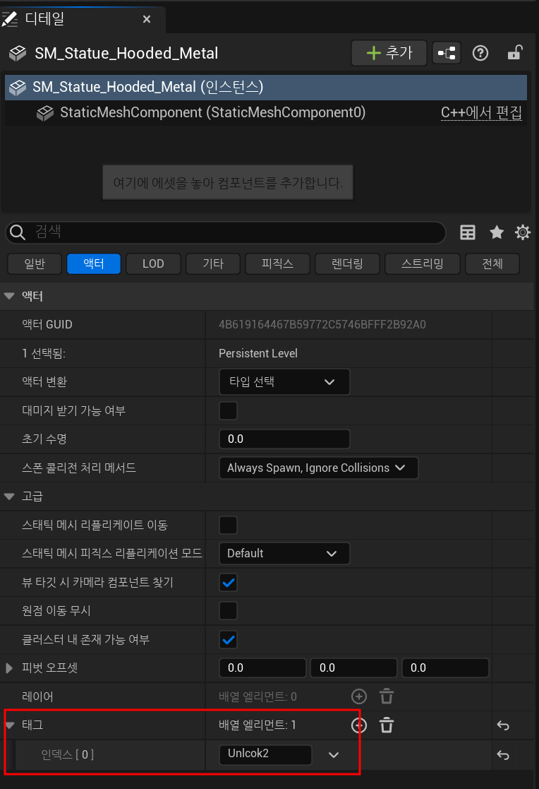 이어서 조각상에도 Unlock2 이름으로 태그를 추가해준다.