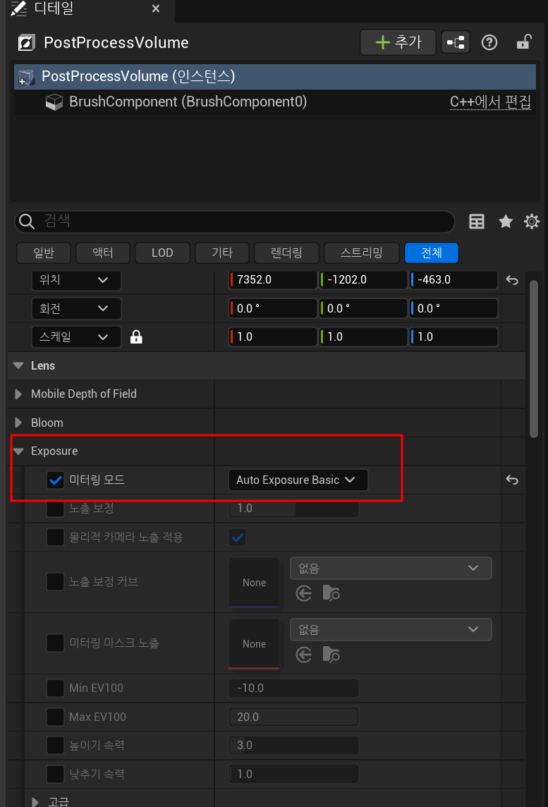 포스트 프로세스 볼륨의 노출 칸에 있는 미터링 모드를 변경함으로서 해결이 가능하다.