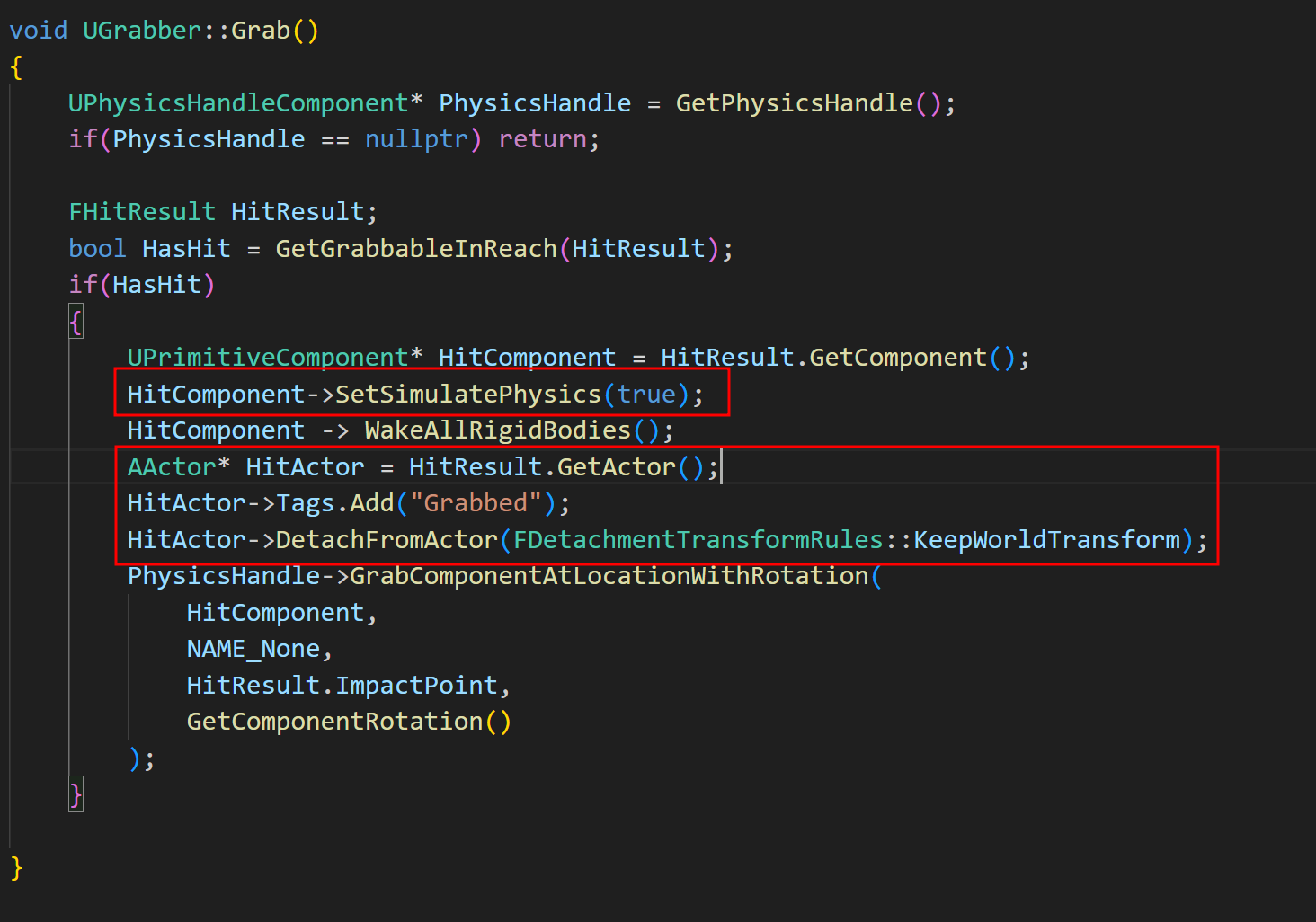 따라서 집는 순간에 피직스시뮬레이트를 활성화하도록하고, 어태치된 것을 디태치시켜줄 필요가 있다.