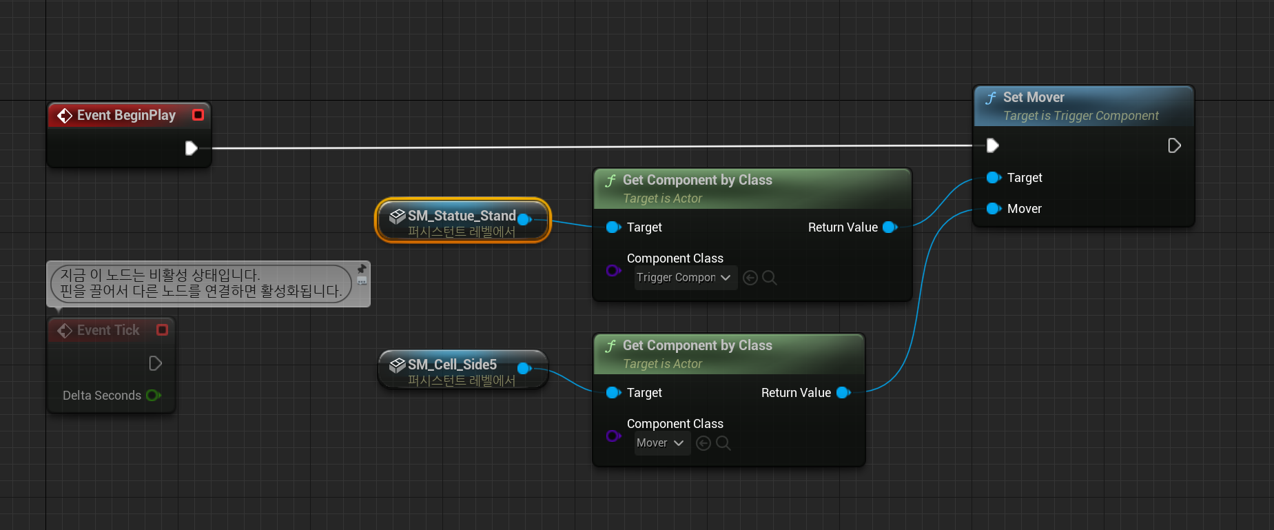 블루프린트 레벨을 열고, 조각상의 트리거 컴포넌트와 창살의 무버 컴포넌트를 가져와서 Set Mover 함수에 연결하여 Mover를 활성화해준다.