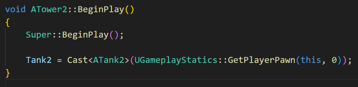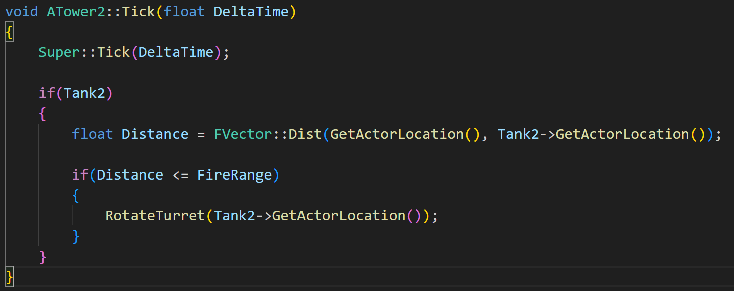 우선 탱크 포인터를 얻는 것은 BeginPlay 함수에서, 나머지는 Tick 함수에서 진행하게 된다.