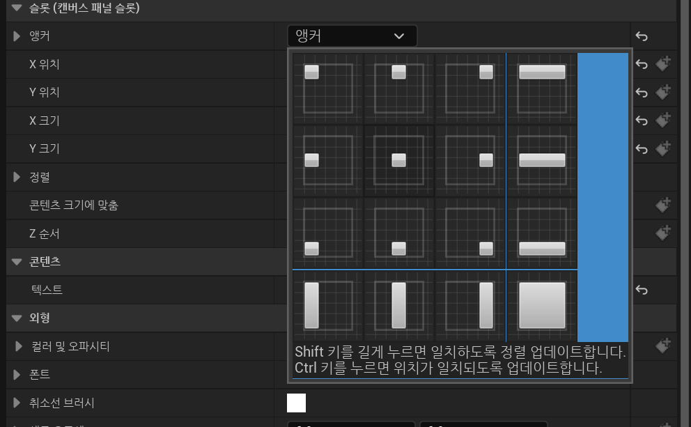 이러한 앵커를 통해 텍스트 블록 위치 조절이 가능하며, 우측 디테일 창에서 조정이 가능하다.