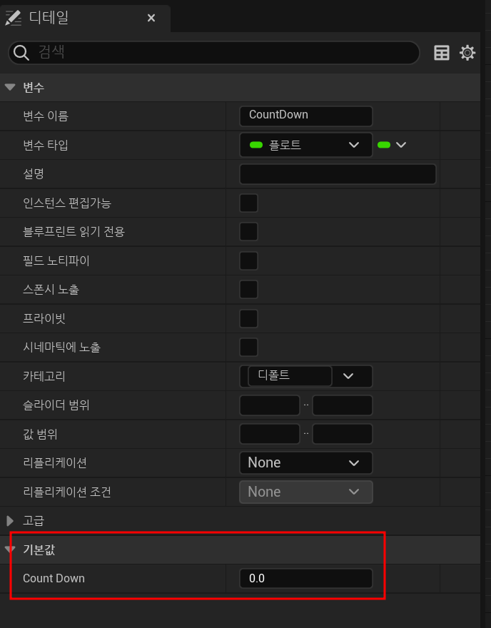 그리고 카운트 다운을 위한 float 변수를 하나 추가해주자.
