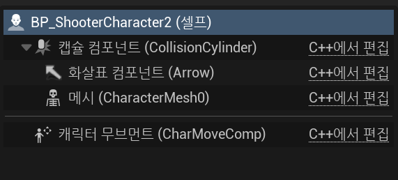 그리고 각 C++ 클래스를 기반으로 다시 블루프린트를 생성하고 컴포넌트를 살펴보자.