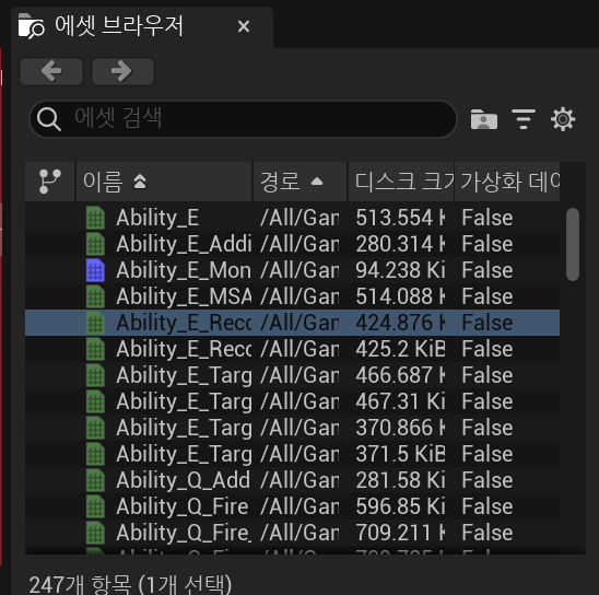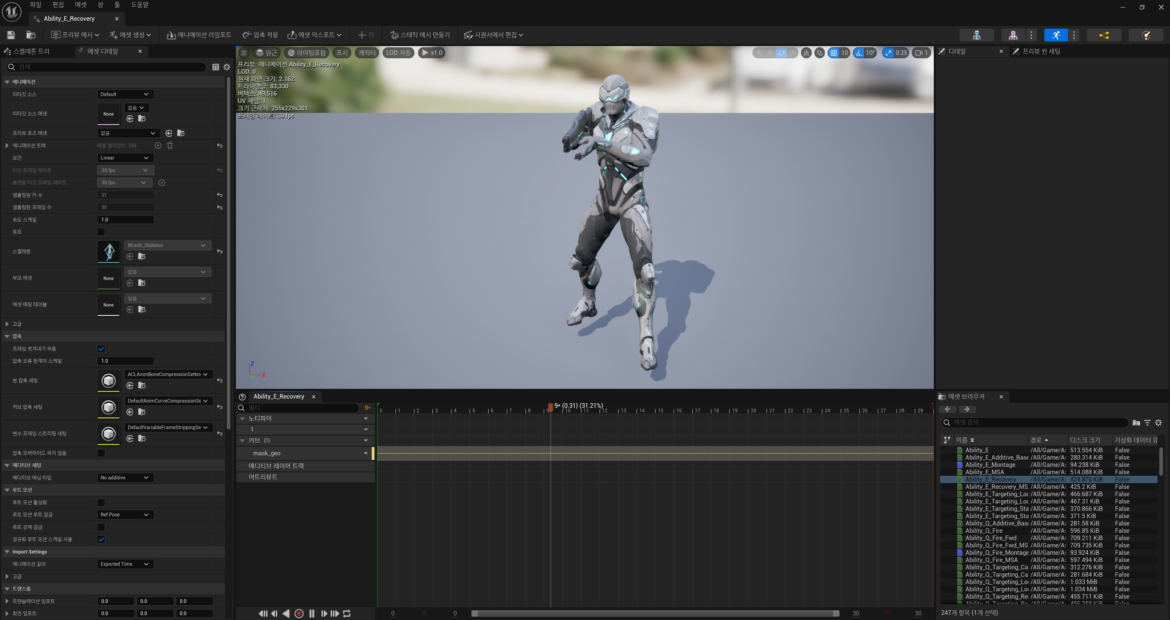 해당 화면을 통해 애니메이션이 동작하는 모습을 볼 수 있고, 우측 하단의 에셋 브라우저를 통해 다른 애니메이션들도 체크하는 것이 가능하다.