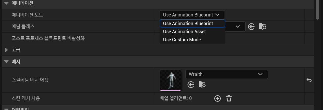 이를 위해 캐릭터 블루프린트 화면으로 돌아가보면 메시를 할당하는 칸 위에 애니메이션이 존재하는 것을 볼 수 있다.