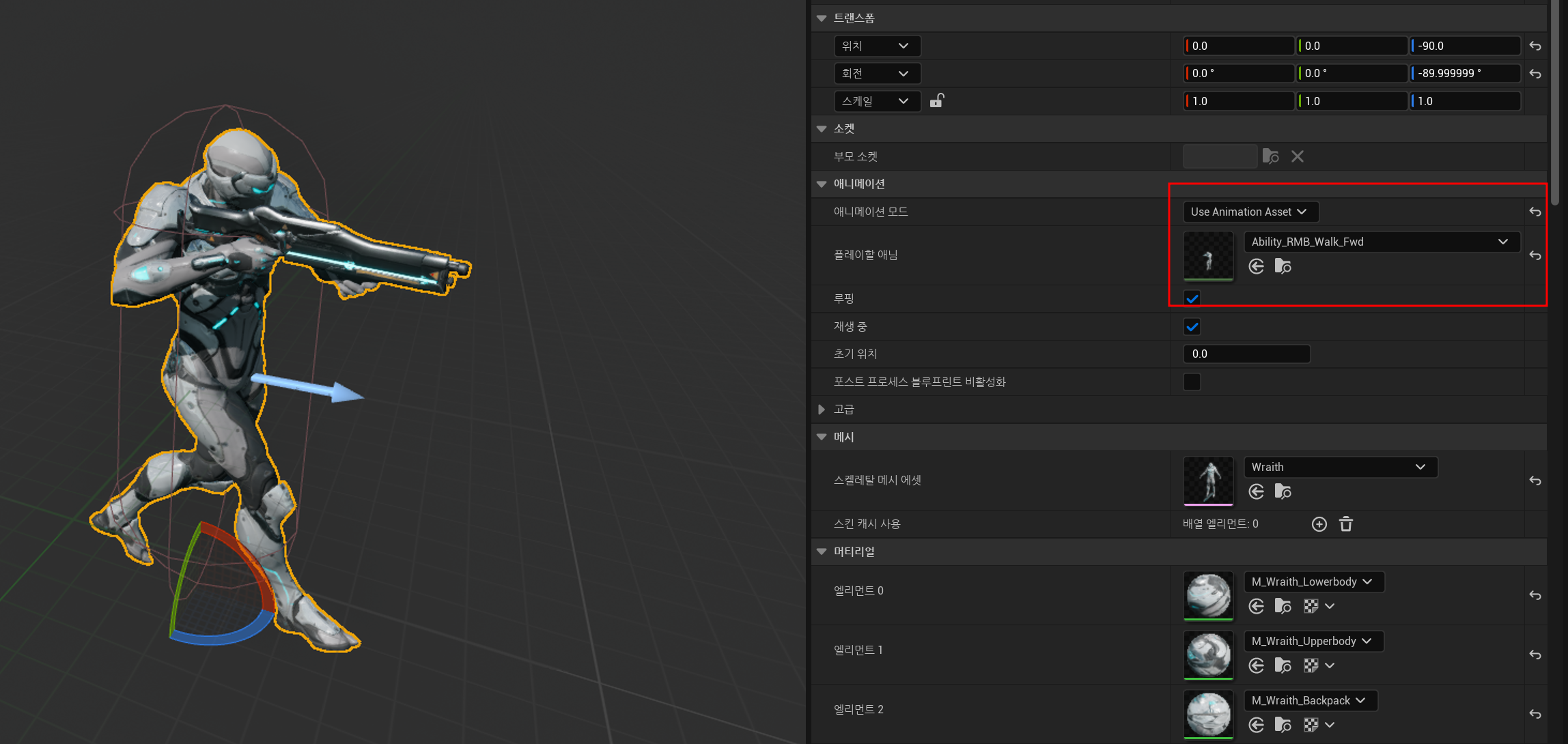 하지만 우리가 할당한 애니메이션은 말그대로 앞으로만 걷는 동작이기에 옆으로 이동해도, 뒤로 이동해도 앞으로 걷는 모션을 취한다.