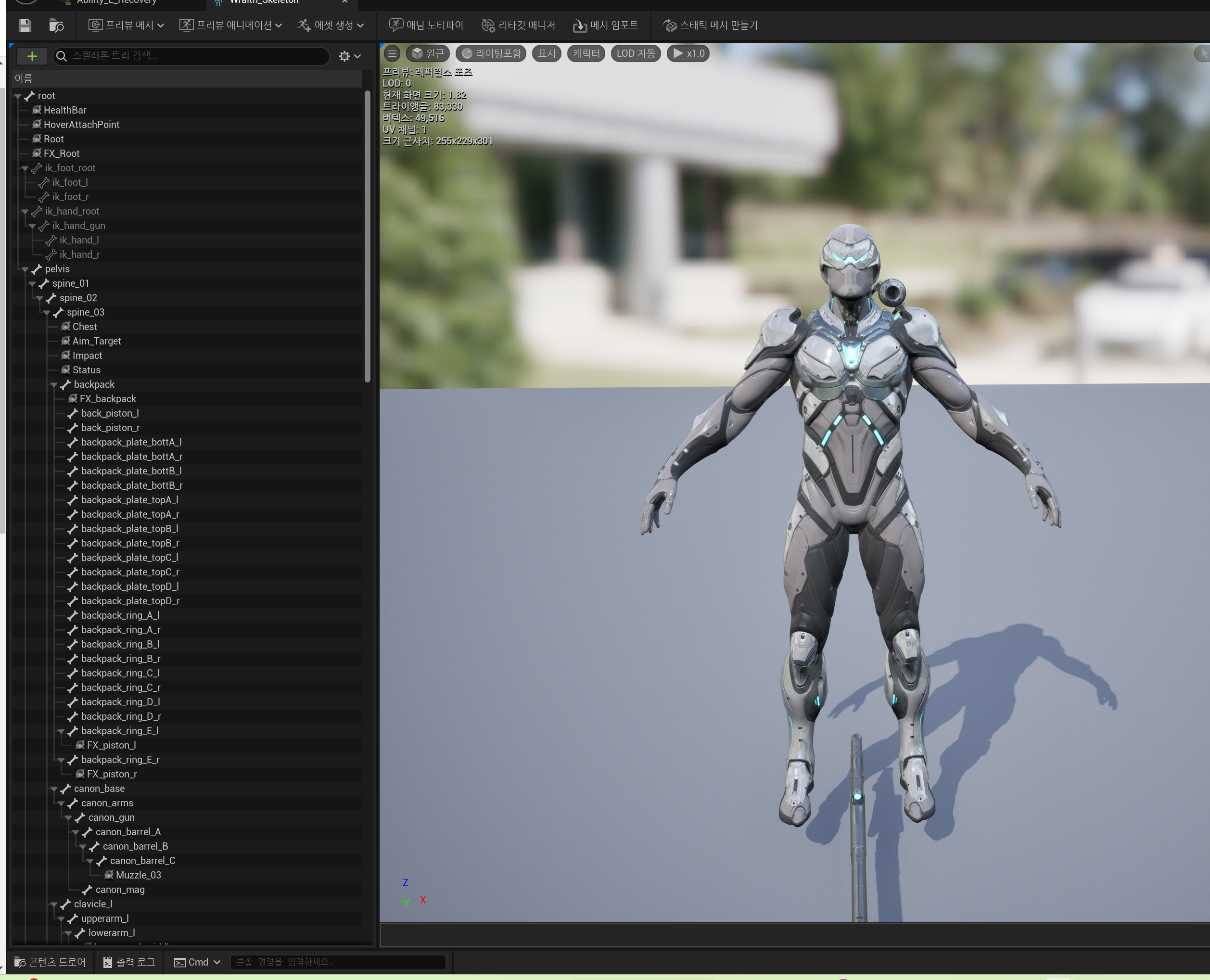 해당 화면에서는 스켈레톤 메시를 체크가 가능하며, 해당 스켈레톤 메시를 구성하는 스켈레톤을 일일히 체크하는 것이 가능하다.