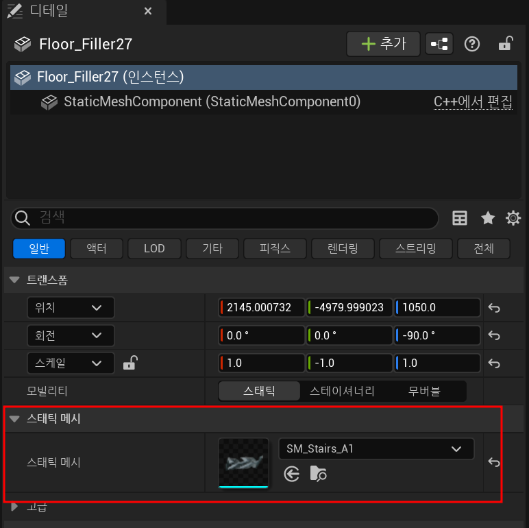 위 사진의 튀어나온 콜리전을 선택하여 해당 콜리전의 스태틱 메시를 확인해보자.