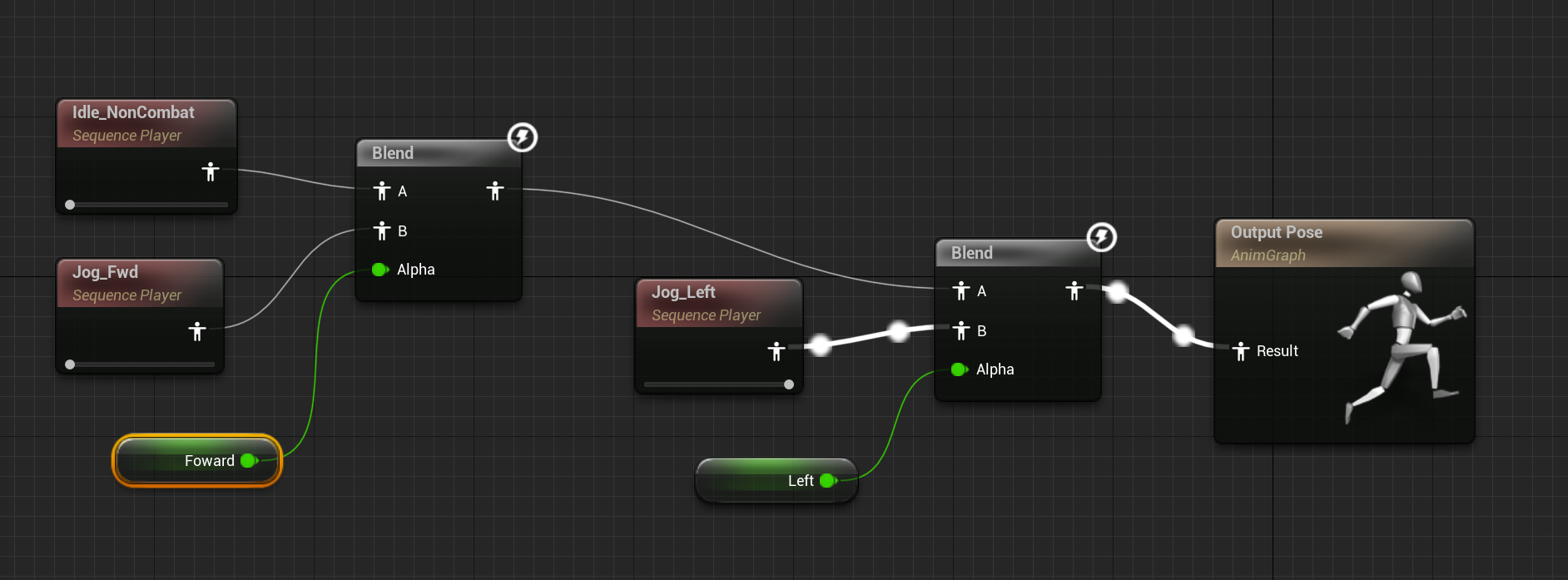 우선 앞으로 가는 동작은 알파값에 따라서 뛰는 동작 또는 idle 값이 섞여 다소 느릿하게 가는 모습을 연출할 수 있다.