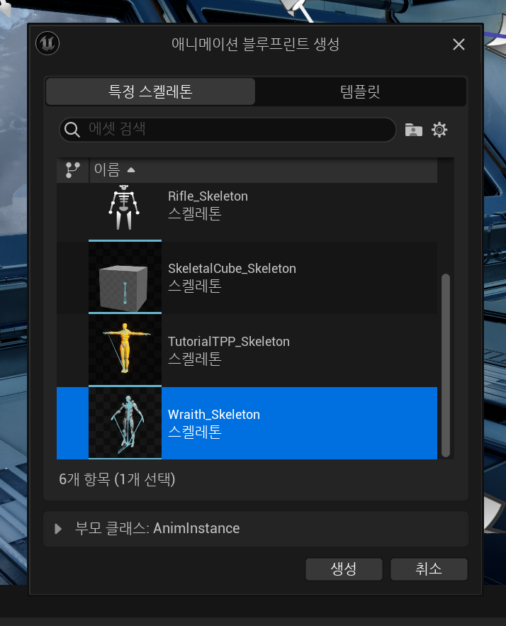 생성시에 우리가 사용할 스켈레톤 메시를 선택해주어야 한다.