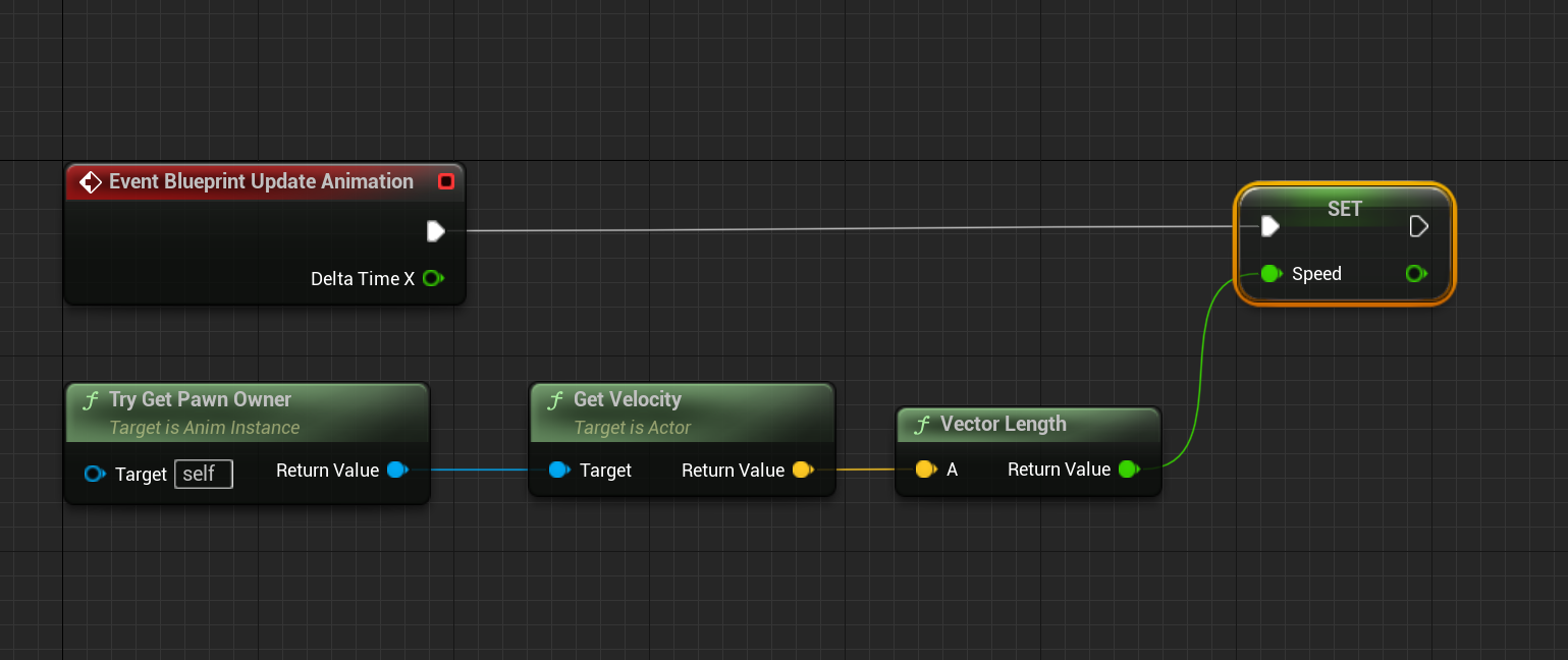 이제 Try Get Pawn Owner 함수를 통하여 캐릭터의 속도를 얻고 이를 Vector Length 함수를 통해 float 값의 크기를 얻어서 Speed 값에 할당해주자.