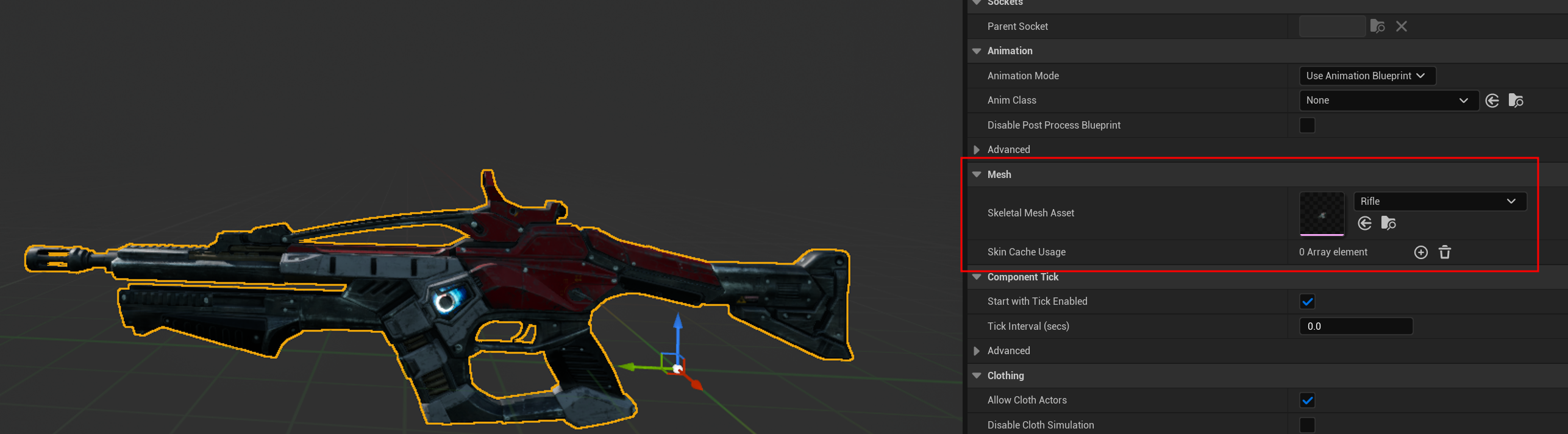 이때 Mesh는 총이 어떤 이유에서인지 스켈레톤 메시로 작성되어있기 때문에 스켈레톤 메시로 선언해주어야 한다.