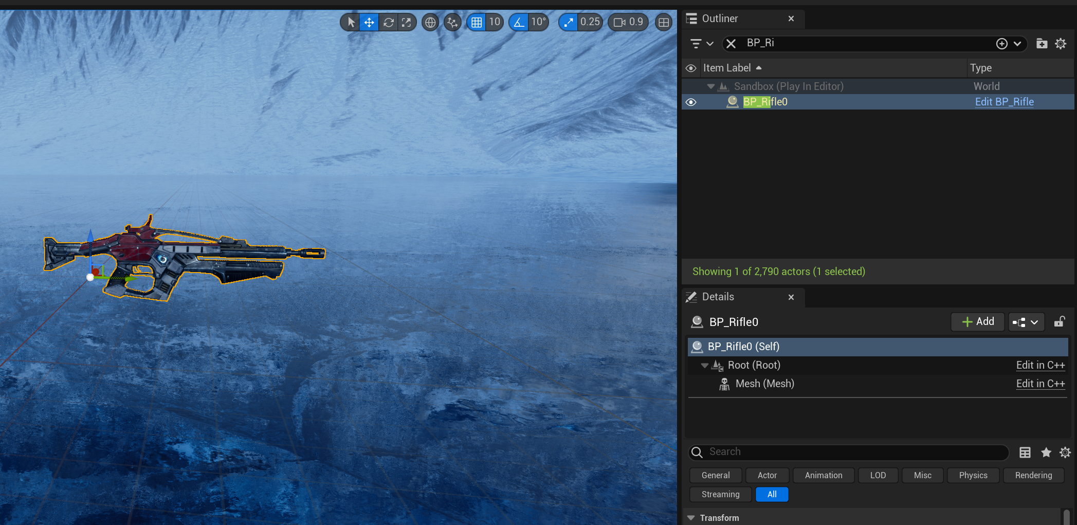 이제 플레이를 해보고 아웃라이너에서 BP_Rifle을 검색해보면 무사히 생성된 것을 볼 수 있다.