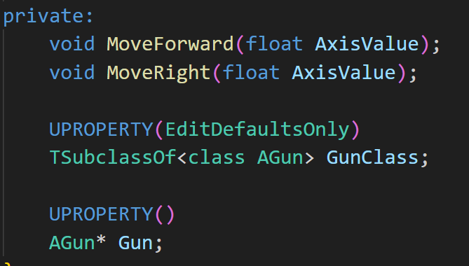 그리고 SpawnActor의 리턴 값을 담을 실제 총에 대한 포인터도 필요하기에 해당 값도 선언해준다.