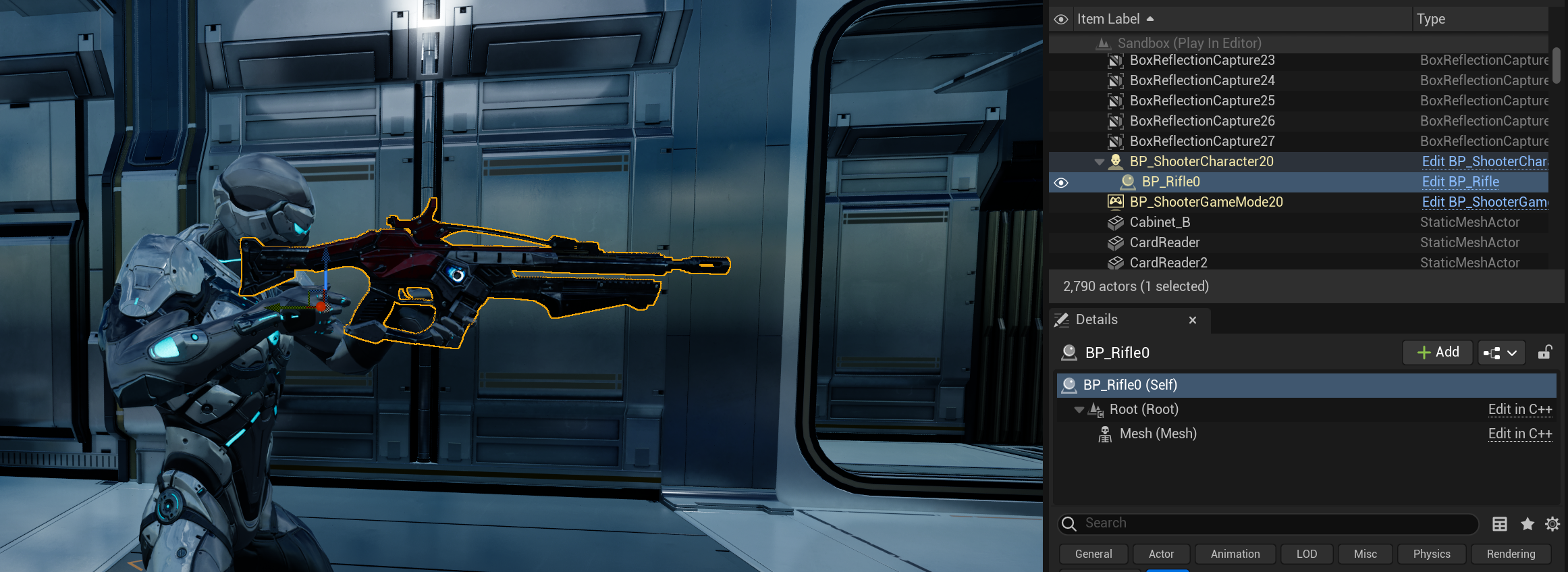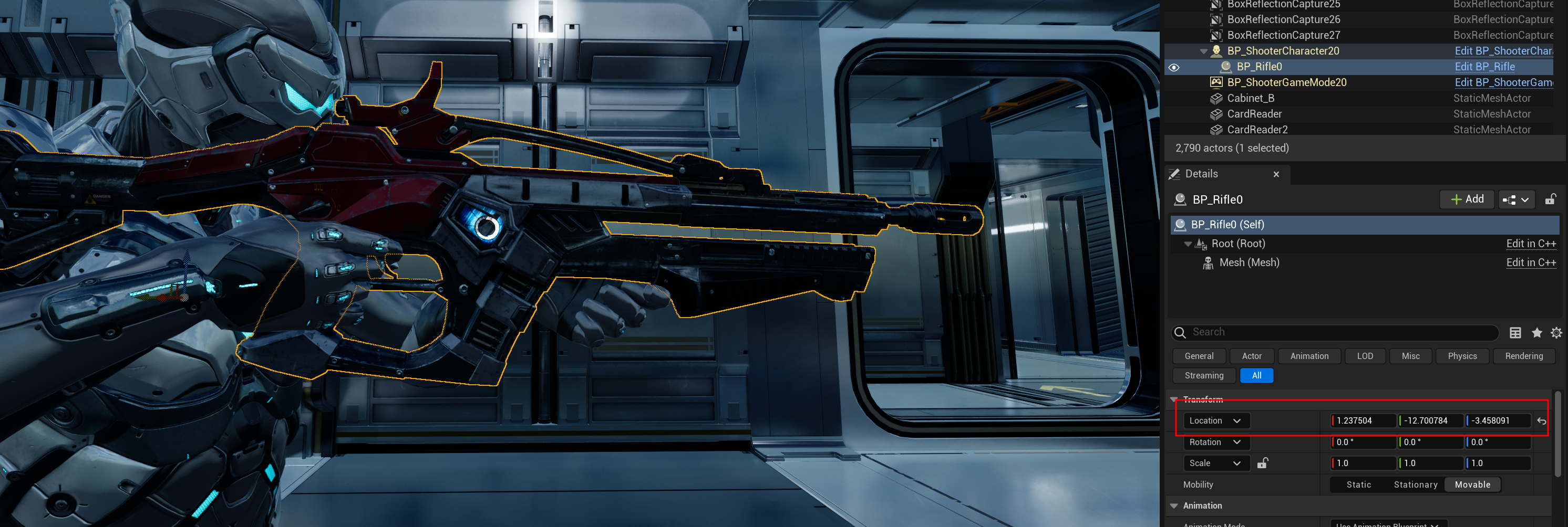 하지만 위치가 살짝 다른데, 이는 해당 화면에서 직접 기즈모를 통해 조절해주고 조절한 값을 기억하여 BP_Rifle의 위치를 해당 위치 값으로 변경해주면 된다.