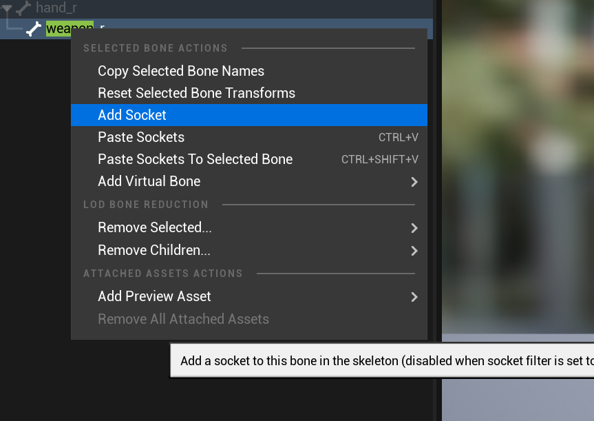 기존 weapon_r의 위치를 사용하기 위해 해당 위치에 소켓을 생성해주자.