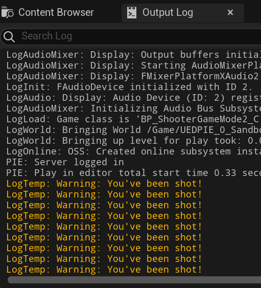 이제 컴파일을 하고 플레이를 하면서 좌클릭을 누르면 PullTrigger 함수에 작성한 로그 메시지가 출력된다.