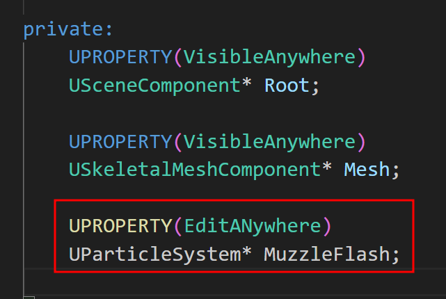파티클 시스템은 따로 헤더에서 선언하고 언리얼에서 할당하도록 해준다.