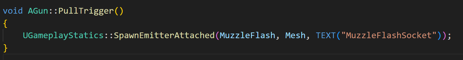 해당 위치를 참고하여 파티클 이펙트를 스폰하게 되며, 이때 사용하는 함수는 SpawnEmitterAttached 함수이다.
