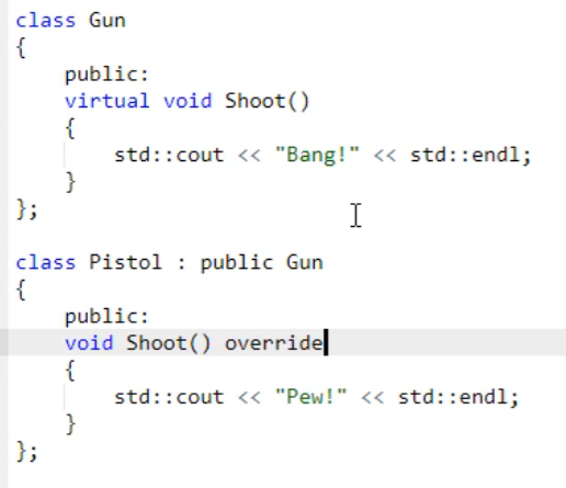 단순하게 생각해보면 Gun타입 포인터 변수에 대해 한번은 Gun 클래스에 대한 주소접근을, 한번은 Pistol에 대한 주소접근을 해서 할당하였으므로, Gun에 대한 Shoot 함수와 Pistol에 대한 Shoot 함수가 호출된다고 생각할 수 있다.