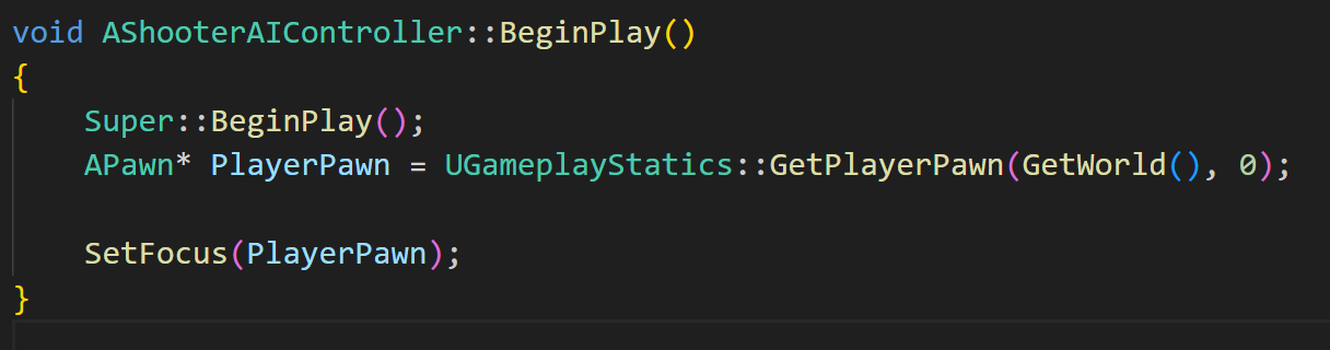 전 강의에서 생성만 했던 SHooterAIController 클래스에서 구현을 하게 되며, 해당 클래스에 BeginPlay 함수를 만들어주고 해당 함수에서 포커스를 하게 된다.
