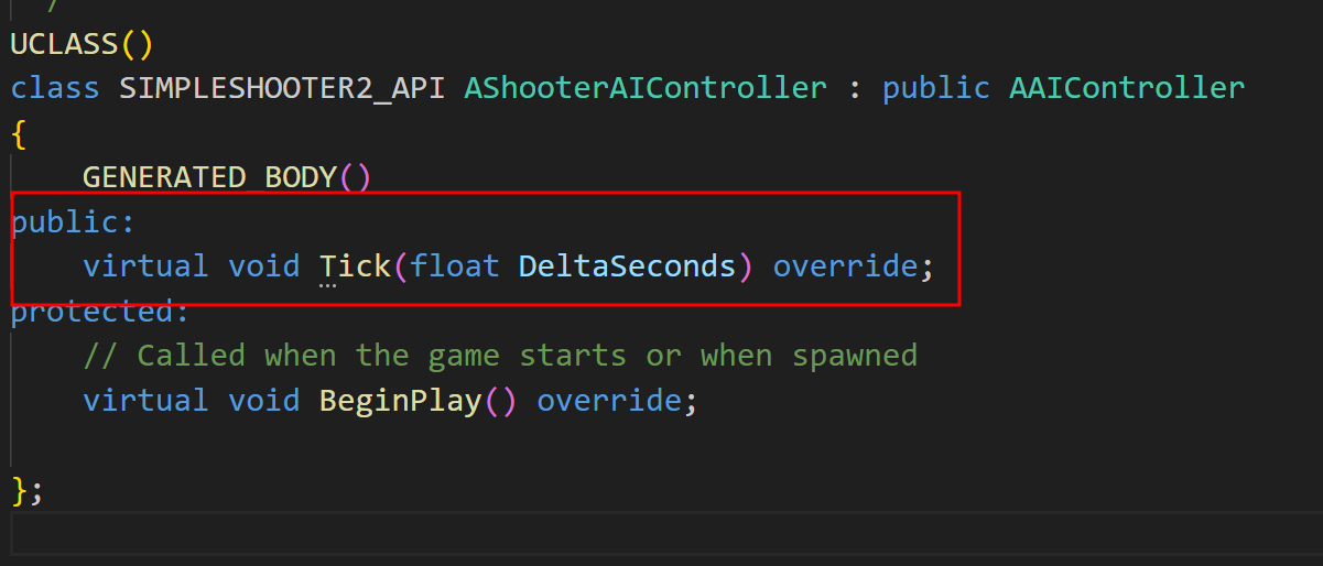 ShooterAIcontroller 클래스에는 Tick 함수가 없으므로 해당 함수도 구현해주자.