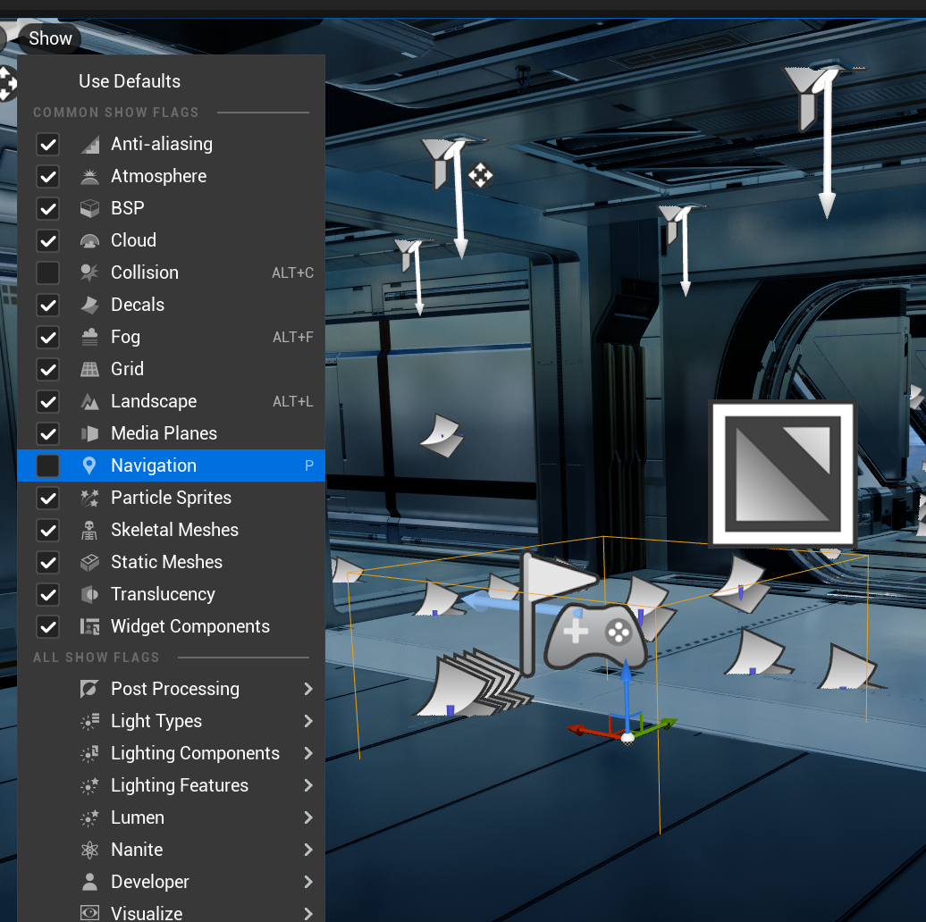 Nav Mesh를 보이도록 하기 위해서는 좌측 상단의 Show 항목에서 Navigation 항목을 활성화 해주어야 한다.