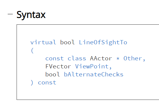 해당 함수를 통해 AI가 다른 액터(플레이어)를 볼 수 있는 지 없는 지에 대해 체크하고 이를 bool 타입으로 반환하게 된다.