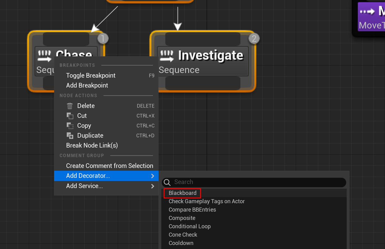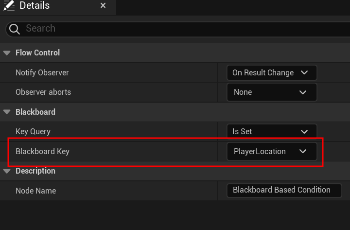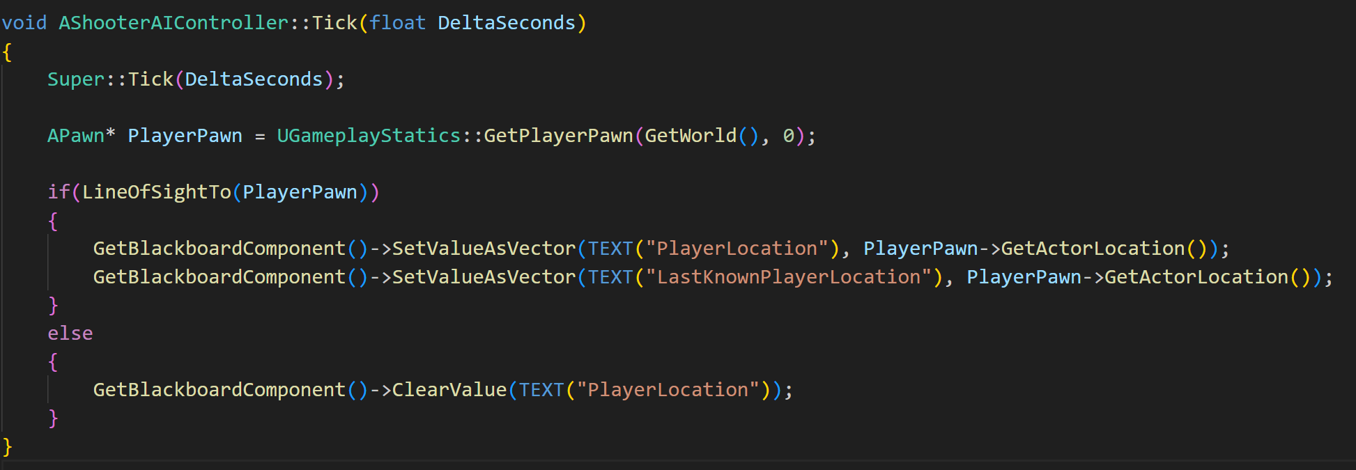 기존 LinOfSightTo 함수를 이용해 플레이어가 시야에 있는 지를 체크하고, 있을 시 PlayerLocation과 LastKnownPlayerLocation 블랙보드 키에 대한 값을 얻어준다.