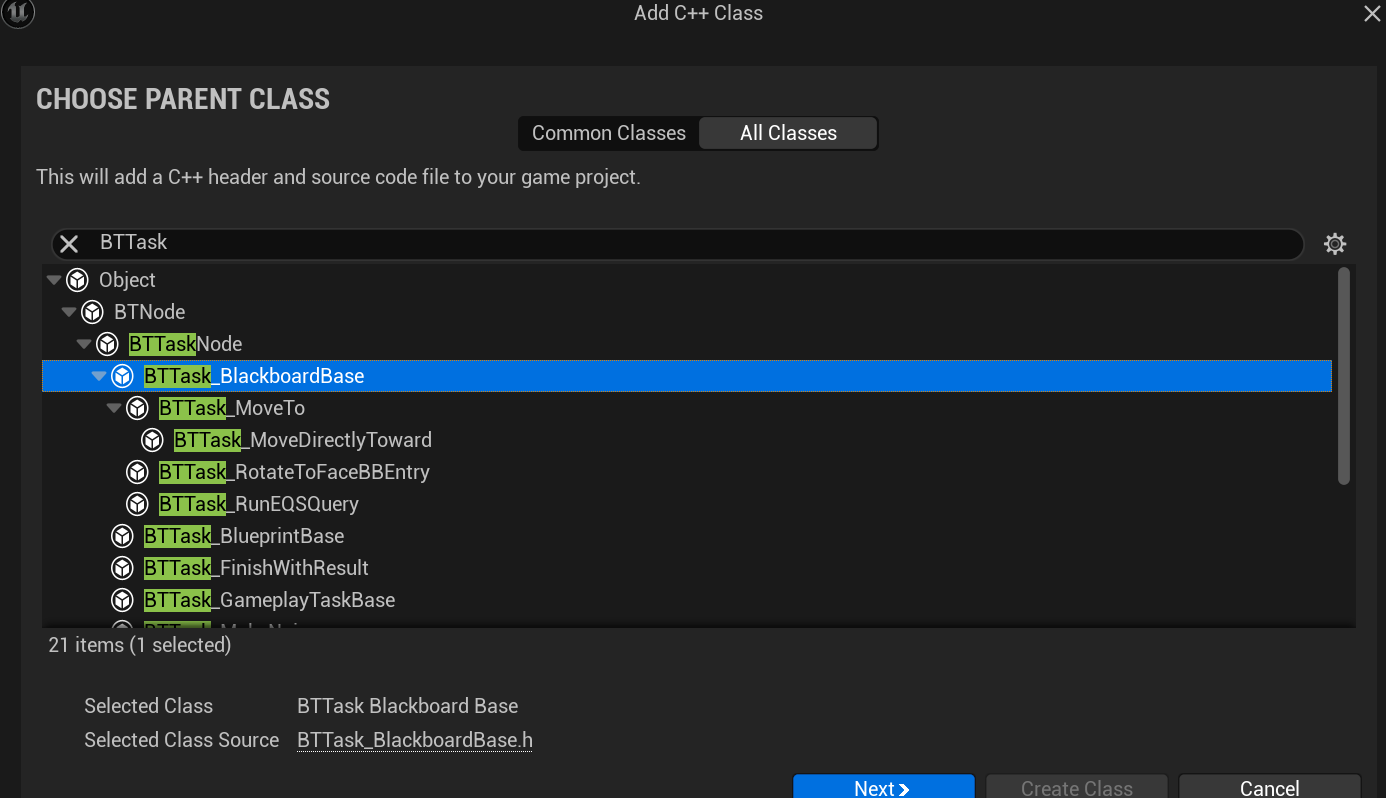 다음으로 BTTask 기반의 C++ 클래스를 새로 생성해준다.
