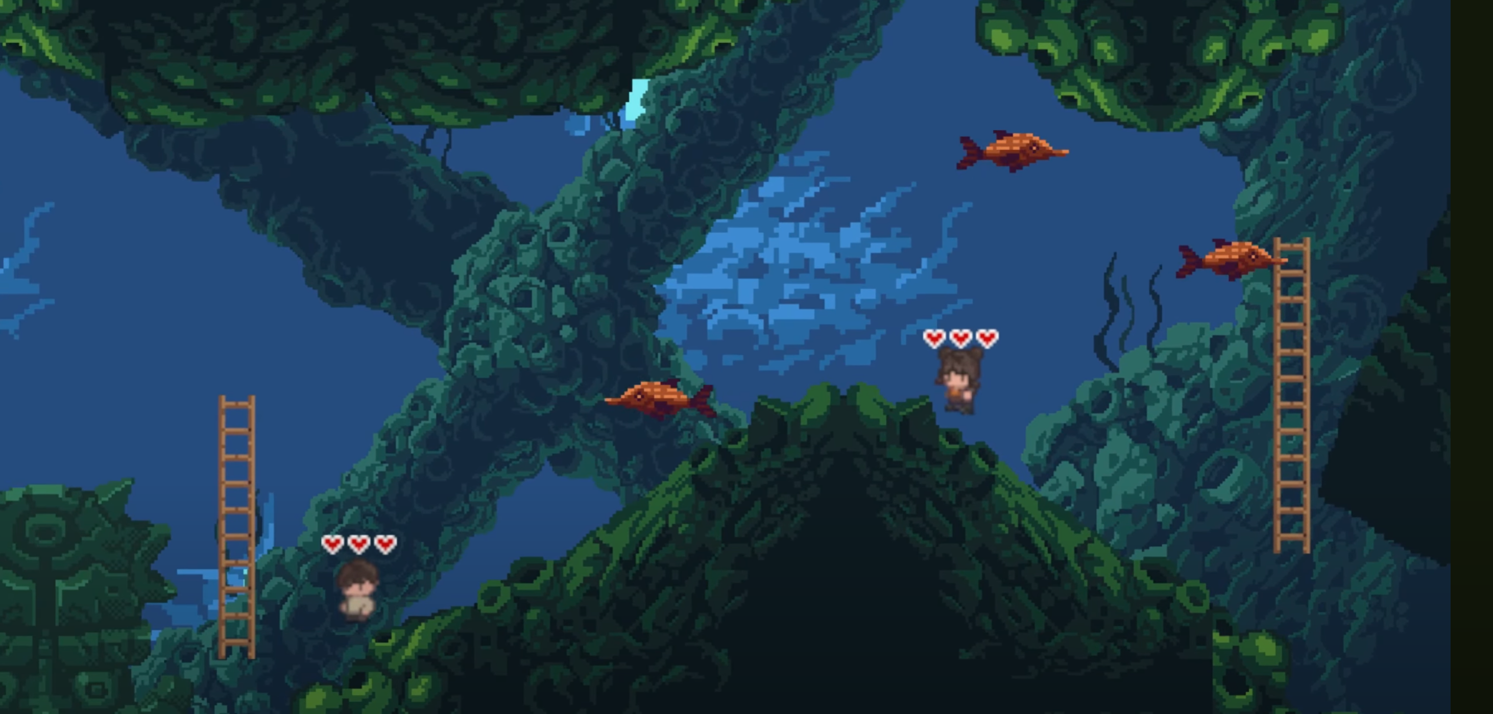 이어서 숲에서는 기존 높이에 비례에 점프거리가 증가하는 점프 블록과 맞으면 체력이 감소하는 가시 함정, 체력을 회복하기 위한 아이템이 새롭게 추가 된다.