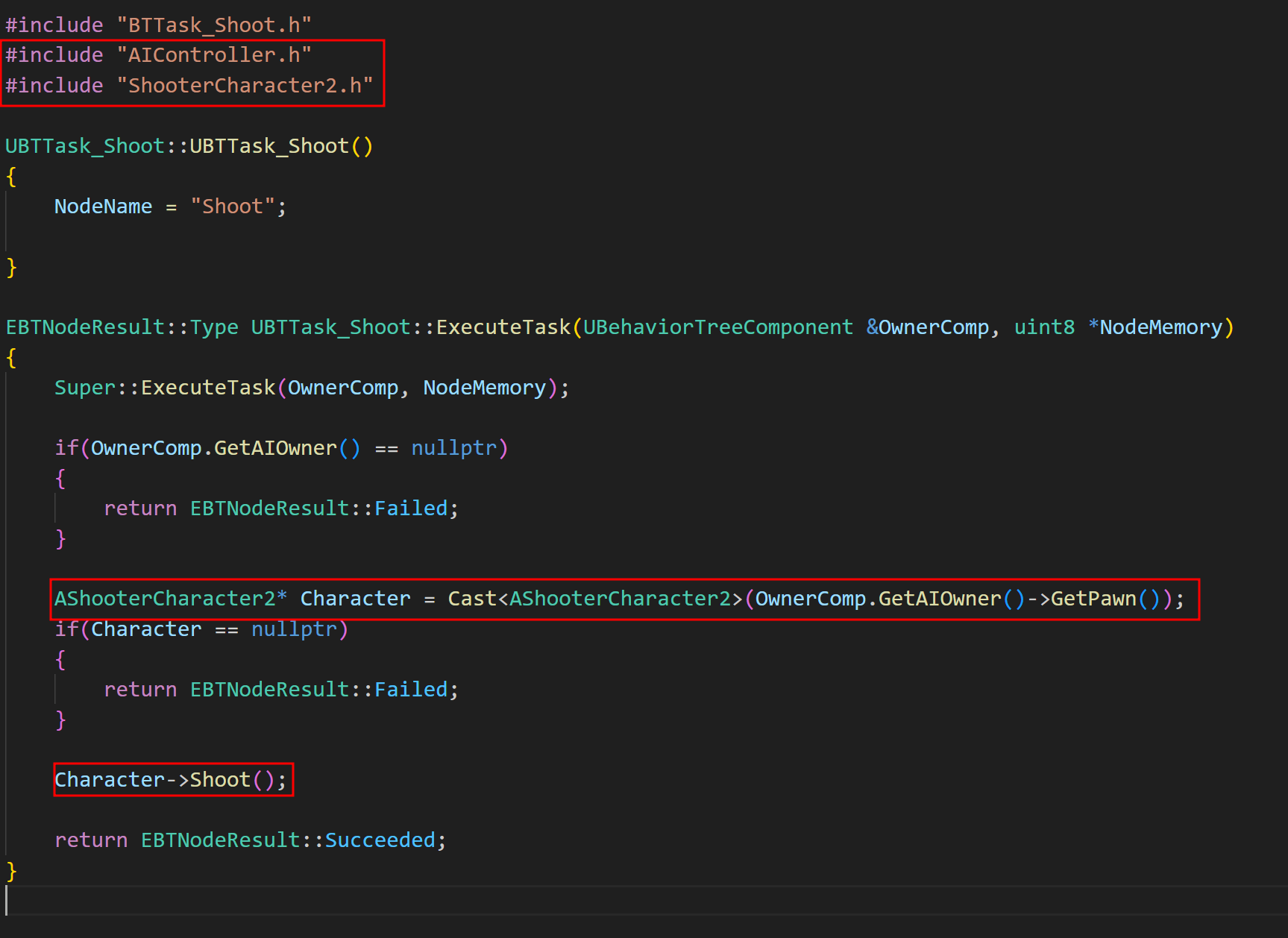 이 과정을 통해 GetPawn 함수를 사용하여 Pawn을 얻고, 해당 Pawn을 기존 AShooterCharacter로 Cast하여 최종적으로 얻은 AShooterCharacter 포인터를 통해 shoot 함수를 호출하게 된다.