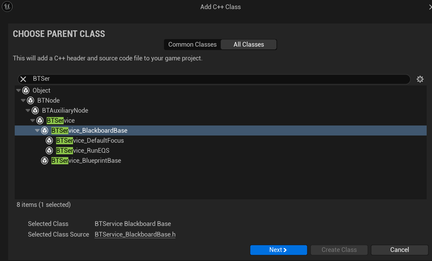 이를 위해 C++ 클래스를 생성해주는데, 우리는 블랙보드 키 값을 통해 설정할 것 이므로, BTService_BlackBoardBase를 기반으로 생성해주자.