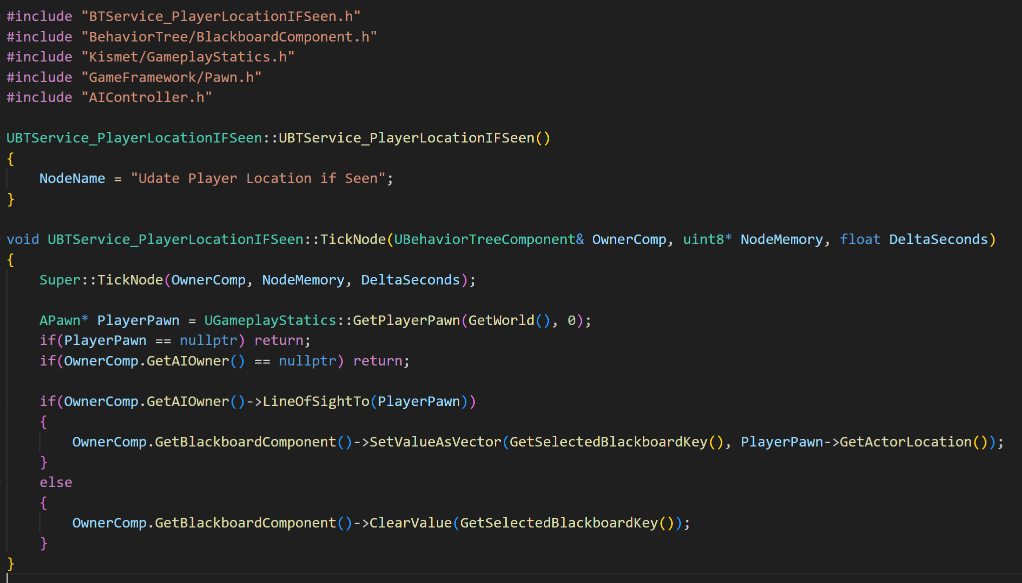 그리고 LineOfSightTo 함수가 AIController에 속한 함수이기 때문에, AIController도 Playerpawn과 마찬가지로 null인지 아닌지도 추가로 체크해주는 것이 좋다.