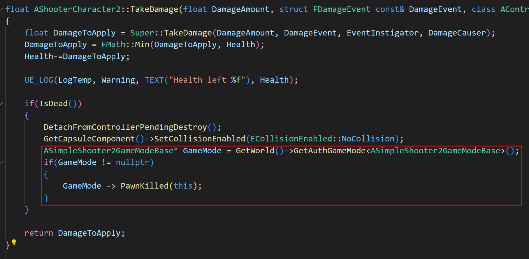 그리고 해당 게임모드 클래스에 PawnKilled를 호출해야 할 위치를 잡아야 하는데, 이는 기존 TakeDamage 함수에 IsDead 조건 안에 작성하게 된다.