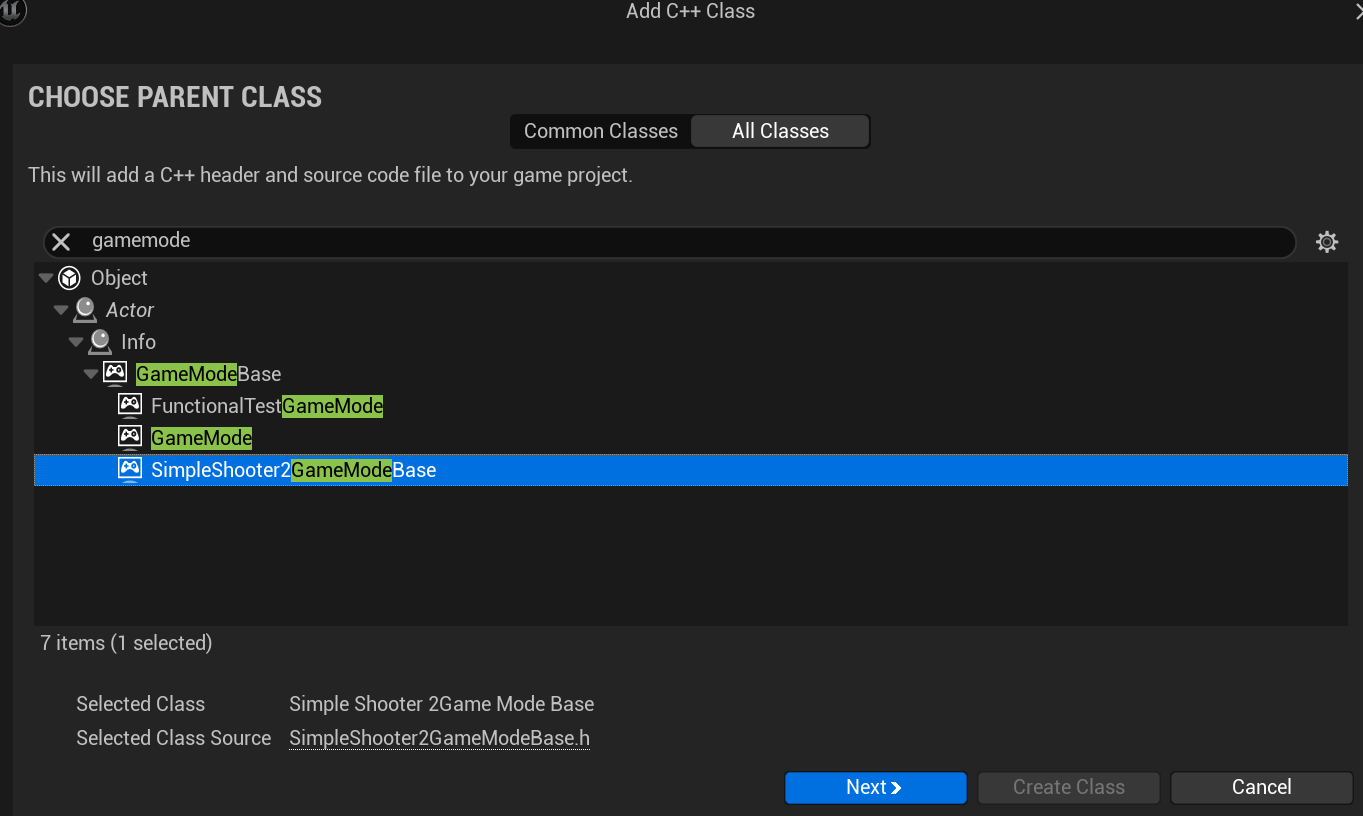 우선 강의에서는 C++로 생성하였기 때문에 게임모드가 있다고 하였으나 놓친 부분이 있는지 내 환경에는 보이지 않아 따로 만들어주었다.