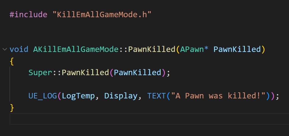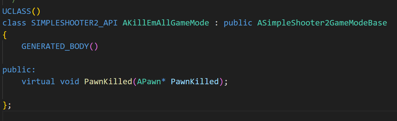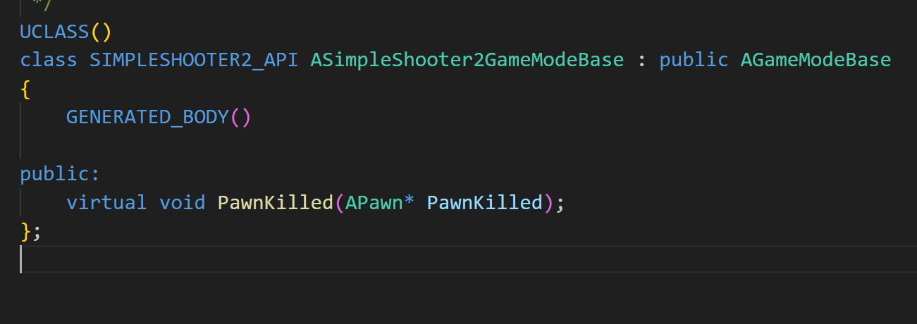 여기서 이제 Pawnkilled 함수를 구체적 내용은 구현하지 말고 몸체만 선언해주자.