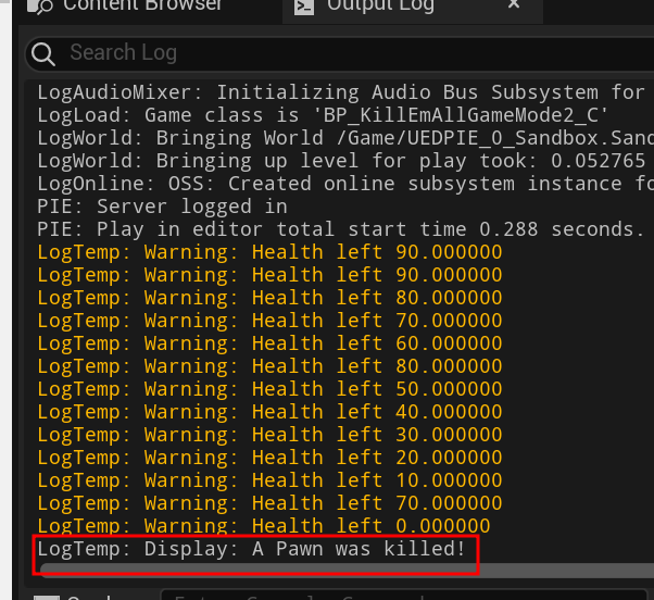 여기서 GetAuthGameMode 함수를 통해 원하는 게임모드를 할당주고, 이를 통해 PawnKilled 함수를 호출해준다.