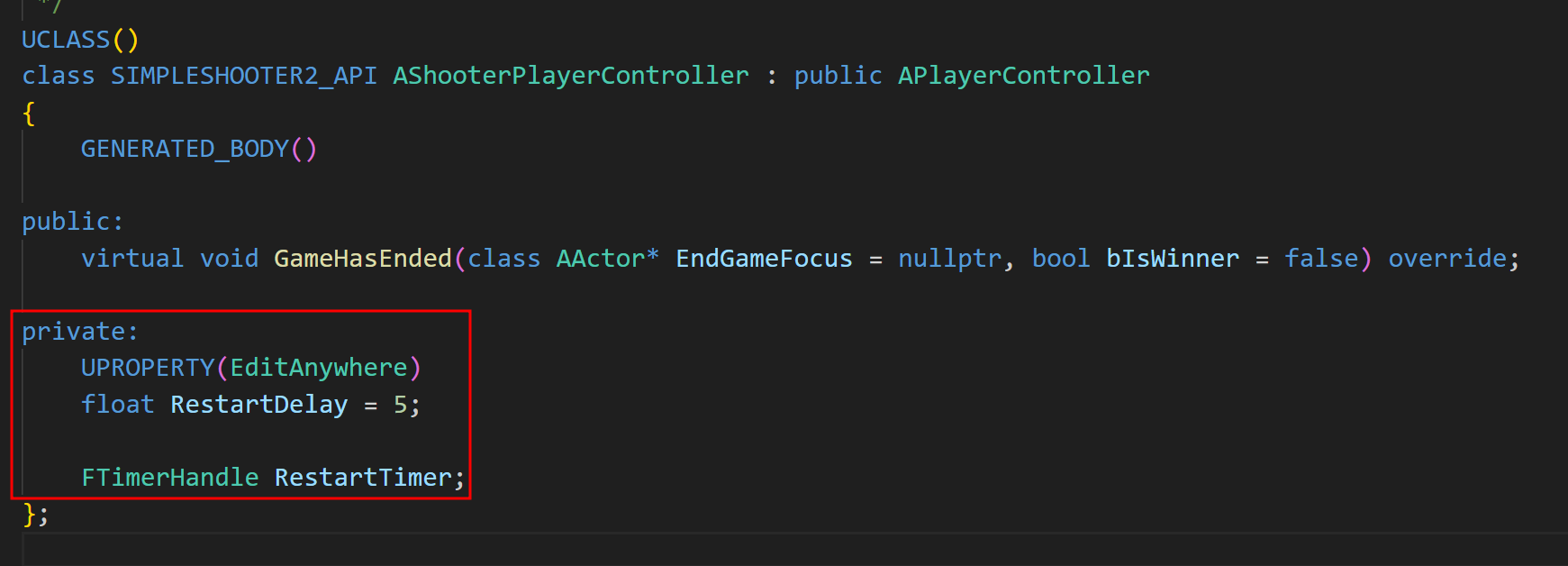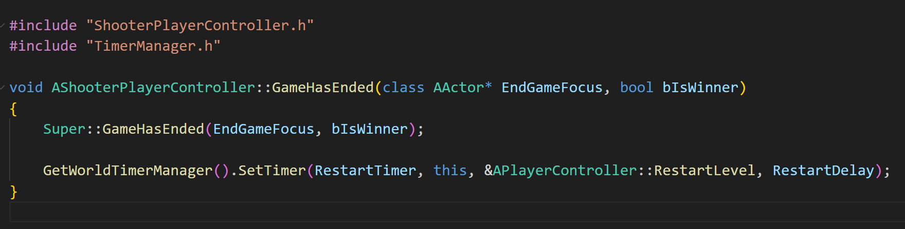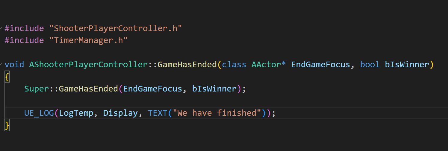 이제 새로 만든 PlayerController 클래스에 GameHadEnded 함수를 오버로딩하기 위해 선언해주자.