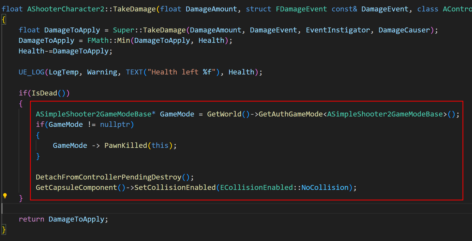 여기서 바로 컴파일을 하기에 앞서 추가로 해주어야 할 작업이 있는데, TakeDamage 함수의 특정 부분의 순서를 바꿔주어야 한다.