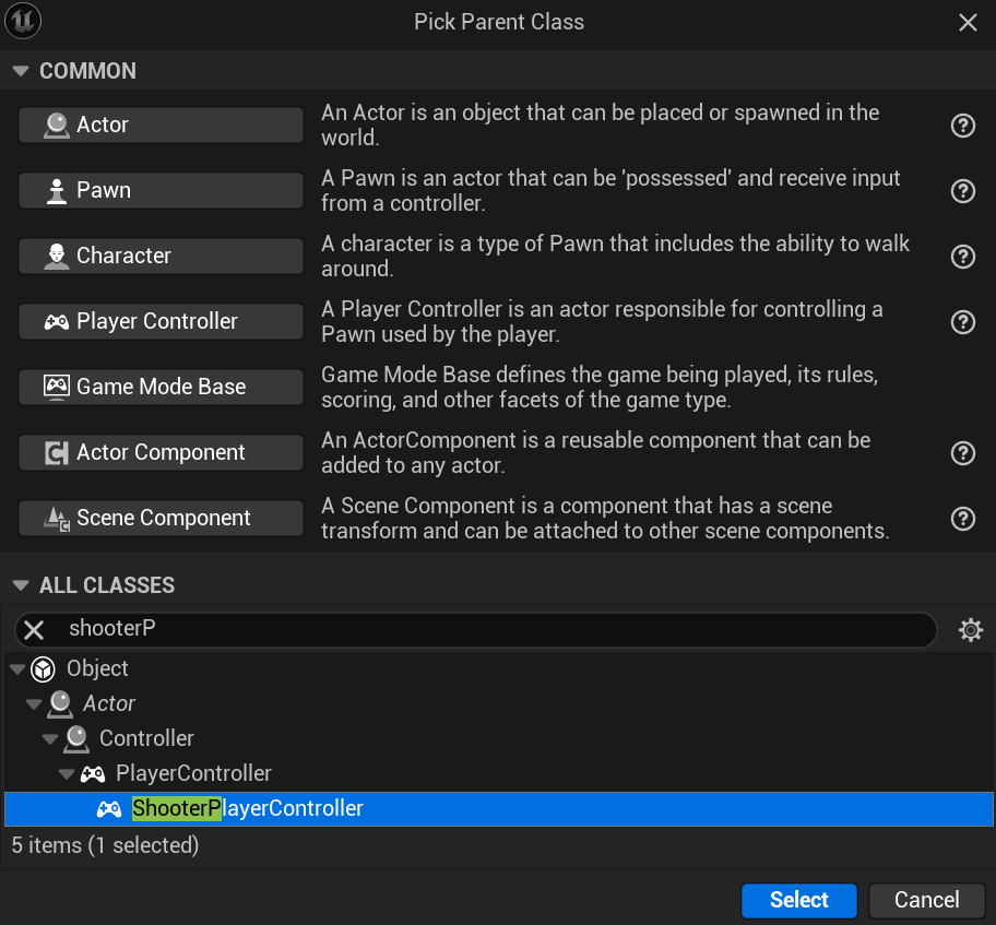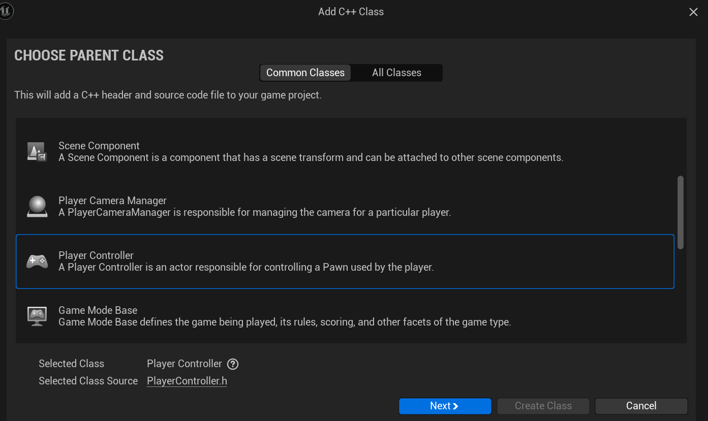 그리고 이제 GameHadEnded 함수를 오버로딩해서 사용하기도하고, 레벨을 다시 시작하는 등의 동작 구현을 위해 PlayerController 클래스를 생성하고, 또 해당 클래스를 기반으로 하여 BP 클래스도 생성해주자.