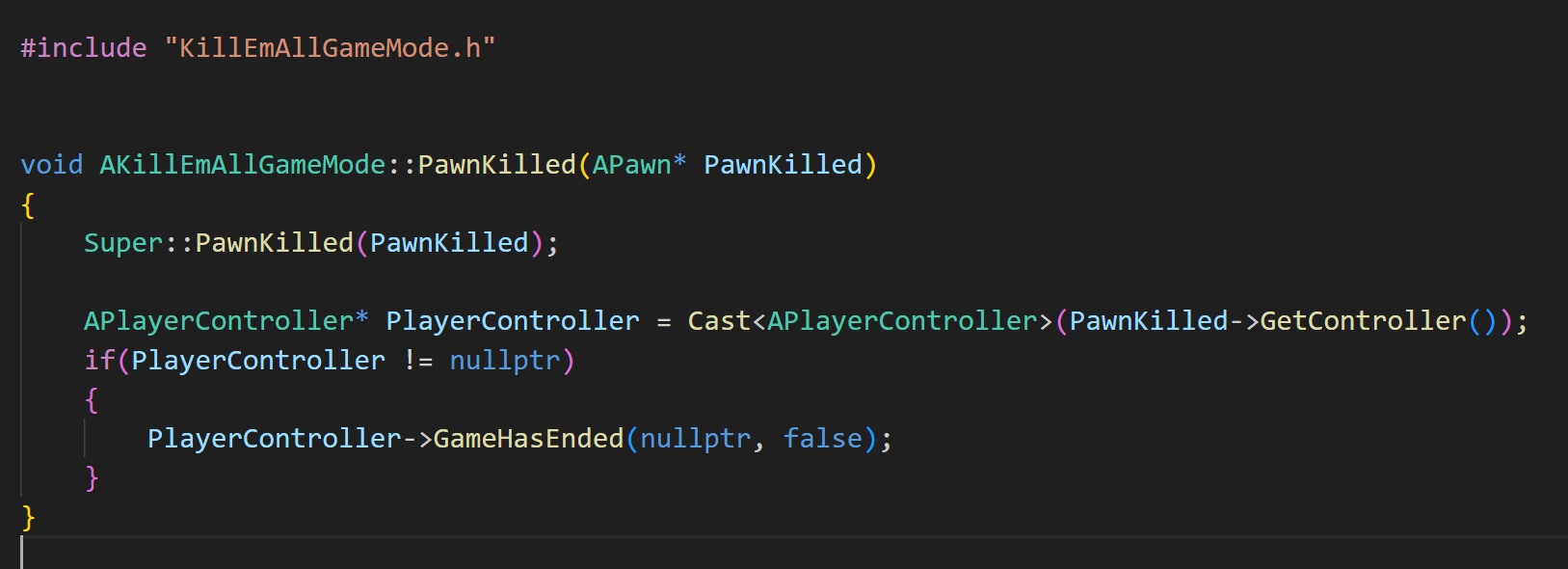 기존에 PawnKilled를 통해 폰이 죽었을 시 로그메시지가 뜨도록 했지만, 이번에는 PlayerController에 속한 함수인 GameHasEnded 함수를 통하여 플레이어가 죽었을시 게임이 종료되는 로그메시지를 출력해보도록 하자.