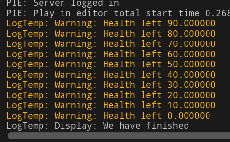 이제 컴파일하고 플레이어가 죽으면 해당 로그메시지가 나오게 된다.